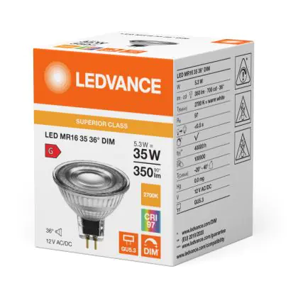 Die Ledvance LED-Spot GU5.3 MR16 6.3W 355lm 36D - 927 Extra Warmweiß | Höchste Farbwiedergabe - Dimmbar - Ersatz für 35W ist eine effiziente GU5.3 LED-Lampe und der perfekte Ersatz für Ihre konventionelle Halogenlampe mit 35W und einem GU5.3-Sockel, bei dem die beiden Stifte einen Abstand von 5,3 mm zueinander haben. Die Abkürzung MR16 zeigt Ihnen, dass der Reflektor einen Durchmesser von 5 cm hat. Zudem strahlt das Produkt Licht in der Farbtemperatur 2700K - Extra Warmweiß aus und punktet durch eine lange Lebensdauer.