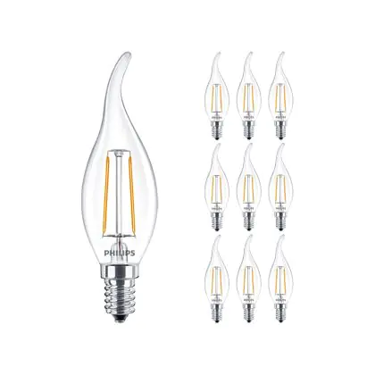 Die Mehrfachpackung 10x Philips Corepro LED Kerze E14 Gebogen-tip Fadenlampe Klar 2W 250lm - 827 Extra Warmweiß | Ersatz für 25W ist eine effiziente E14 LED-Lampe mit Retrodesign und der perfekte Ersatz für Ihre konventionellen 25W Lampen mit E14. Zudem strahlt sie Licht in der Farbtemperatur 2700K - Extra Warmweiß aus und punktet durch eine lange Lebensdauer.