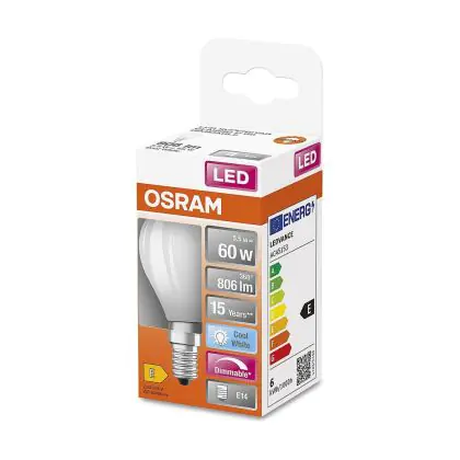 Die Mehrfachpackung 6x Osram Classic LED E14 Kugel Fadenlampe Matt 5.5W 806lm - 840 Kaltweiß | Dimmbar - Ersatz Für 60W ist eine effiziente E14 LED-Lampe mit Retrodesign und der perfekte Ersatz für Ihre konventionellen 60W Lampen mit E14. Zudem strahlt sie Licht in der Farbtemperatur aus und punktet durch eine lange Lebensdauer.